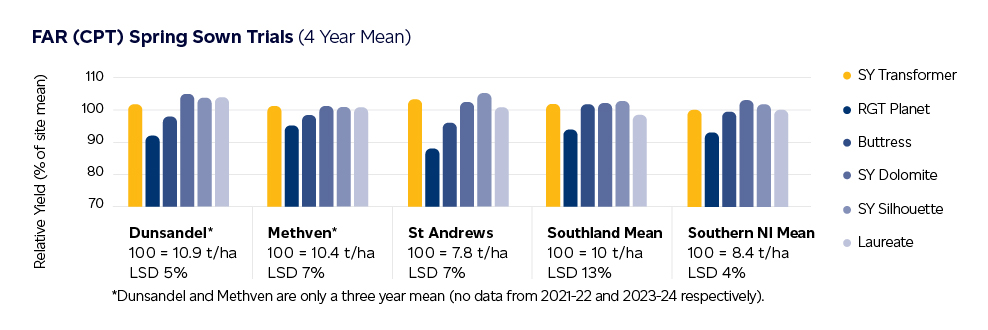 SY TRANSFORMER has high yield potential under all grain growing environments but has excelled under ‘normal’ conditions where it yields more than other barleys. It is one of the highest yielding varieties in both the FAR autumn and spring sown trials when looking at the 4 year means, showing consistency across years and environments.
