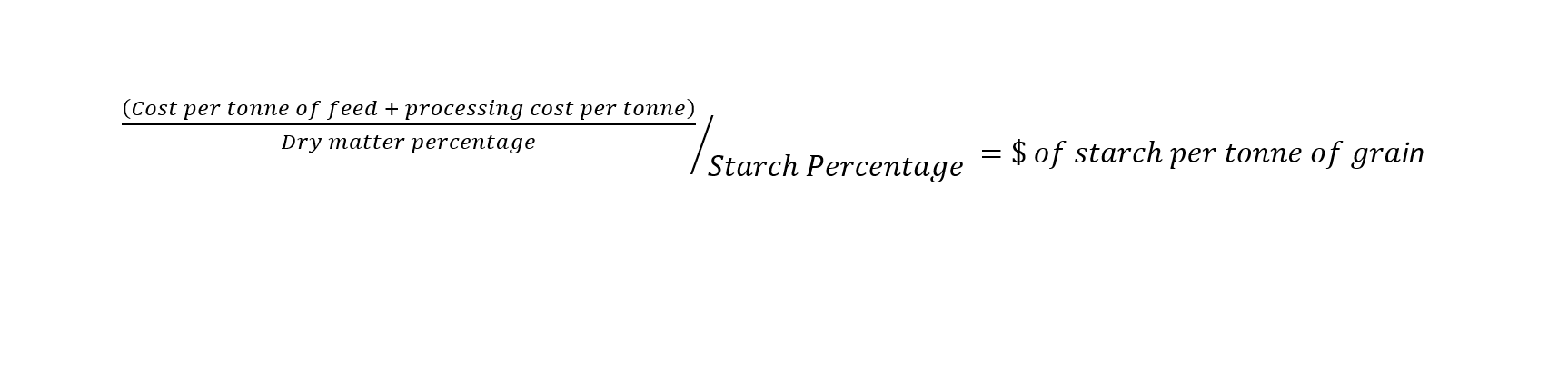 Different dairy feeds can be valued and compared on a $ per tonne of starch basis. The calculation is straightforward. Divide the price of a feed per tonne of DM (t DM) by the percentage of starch in a feed. If barley grain is landed on farm at $500 / t, include a processing cost / t, then convert to $ / t DM. E.g. $500 / t landed on farm plus $50 /t processing equals $550 / t. Divide by the DM percentage (e.g. 86%) equals $640 / t DM. Divide $640 / t DM by 55% starch equals $1162 / t starch.